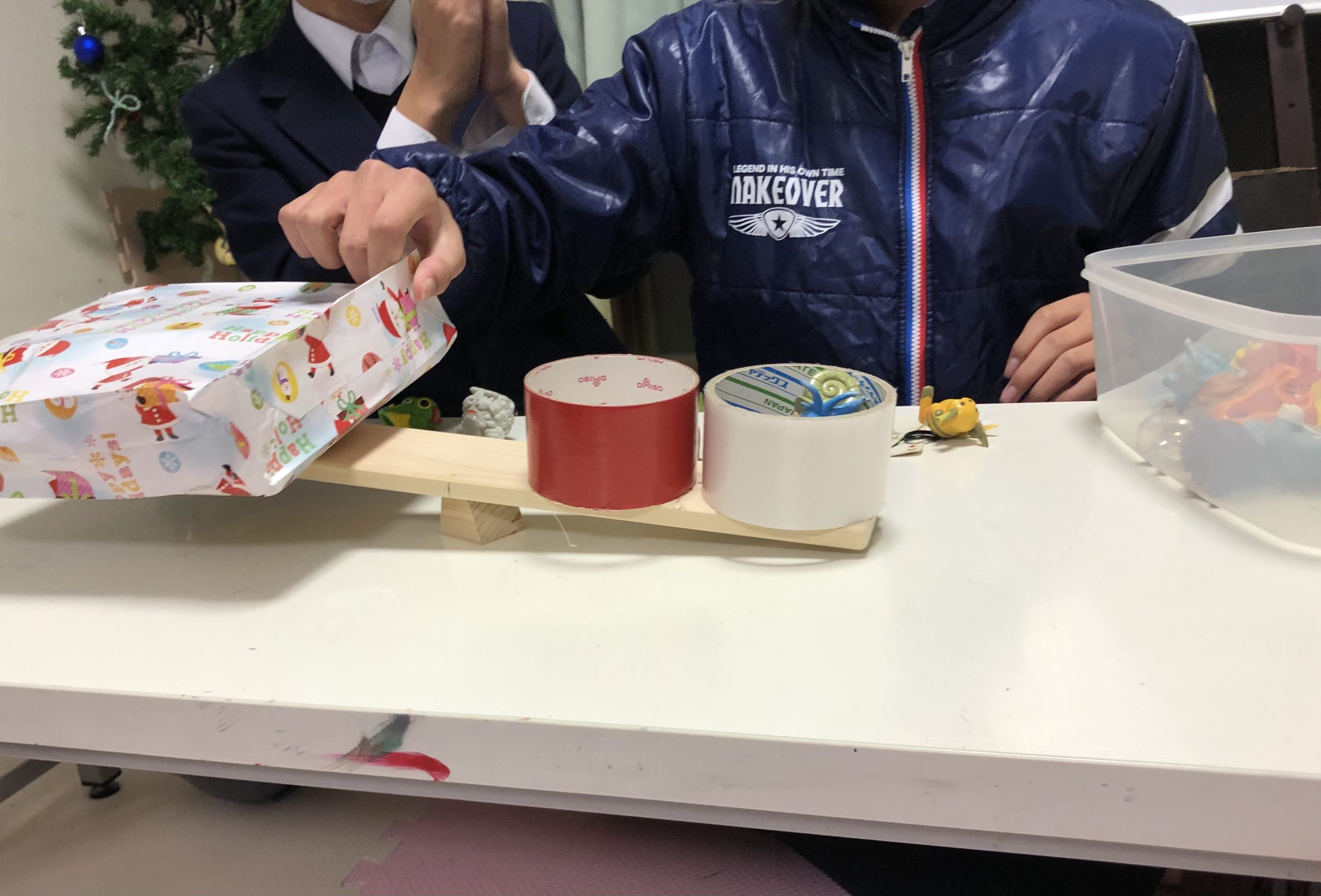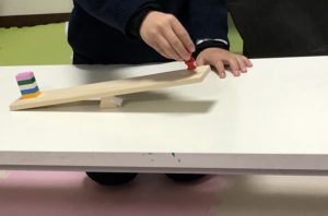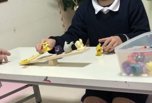 シーソーにお題のものを乗せて、もう片方に同じよーうな重さに合うものを見つけてくる!