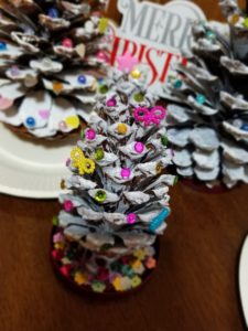 松ぼっくりを白塗り&ラメ付けして子供達に飾り付けをしてもらいました💕