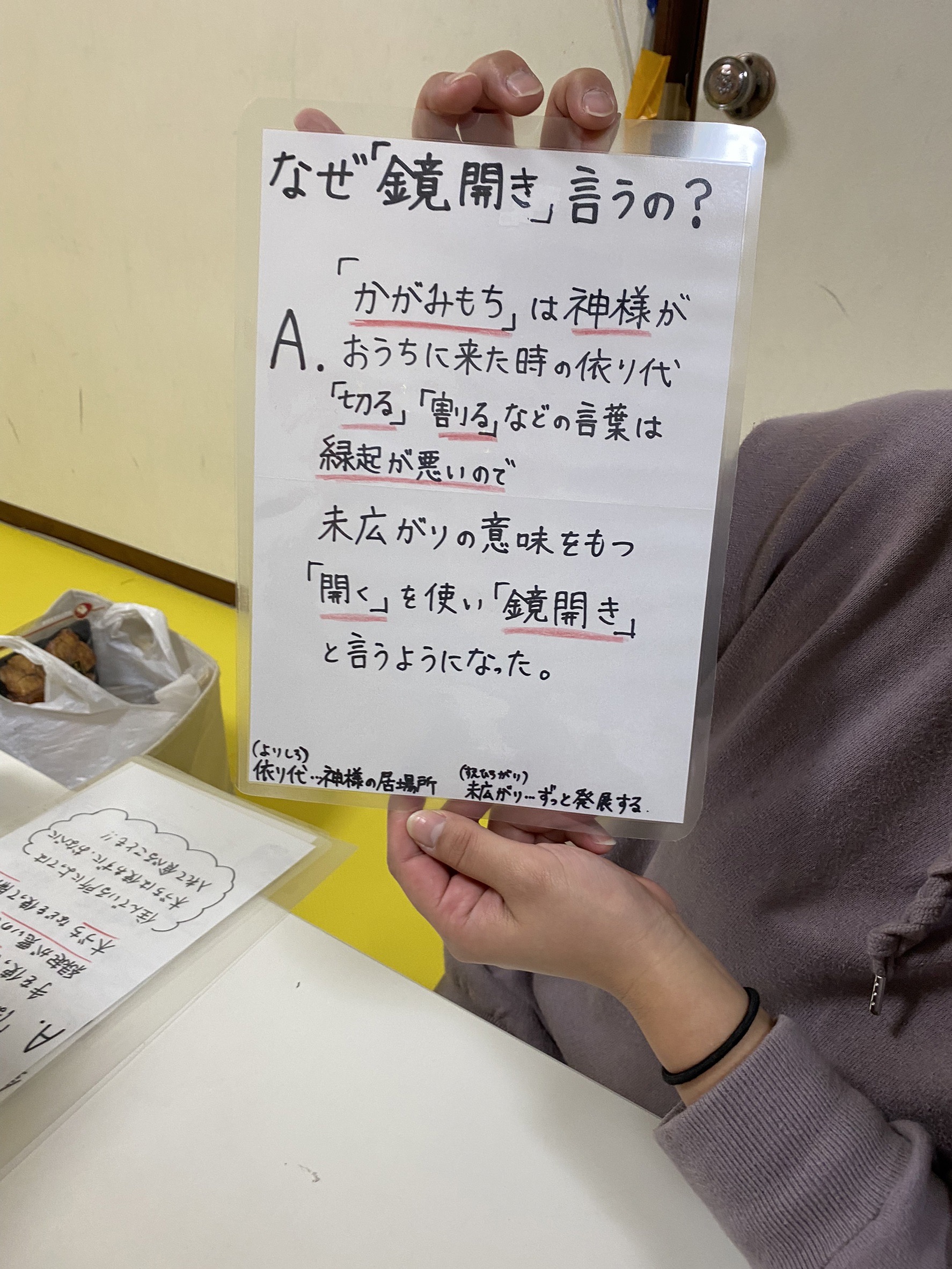 放課後デイぴあ草津みなみ日誌 今日はなんの日~? 今日はイベントの日☆鏡開きです😊まずは鏡開きについてお勉強タイム✨★お正月から今日まで飾られた鏡餅これを今日はどうするの?→今日は割る★では、なぜ鏡割りではなく鏡開きと言うの?→切る、割る の言葉は縁起が悪いからなどなど簡単にお勉強した後に... 2022.01.11 放課後デイぴあ草津みなみ日誌