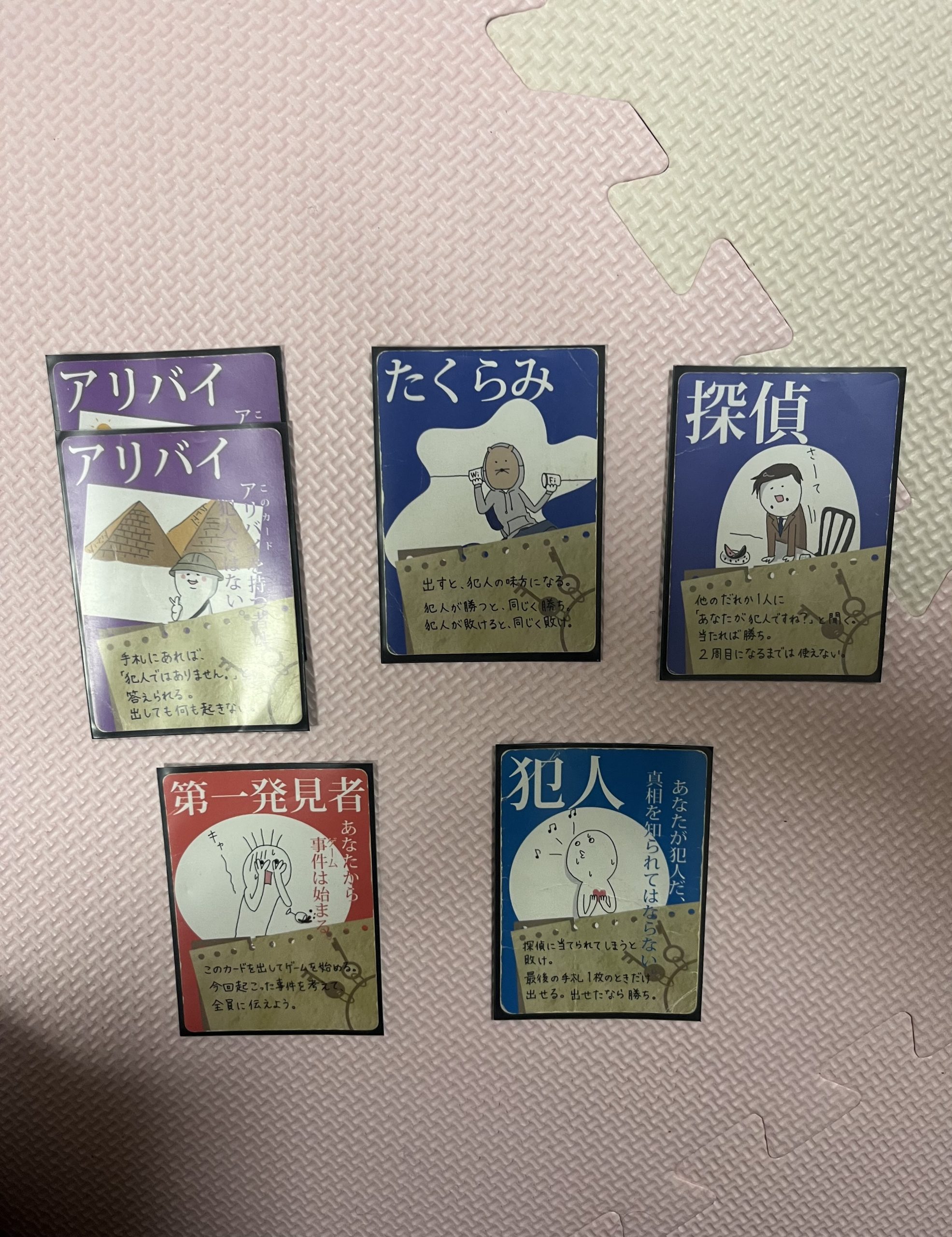 手札を1人4枚ずつ配られ、「第一発見者」のカードを持った人からスタート☝️