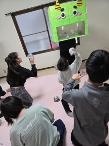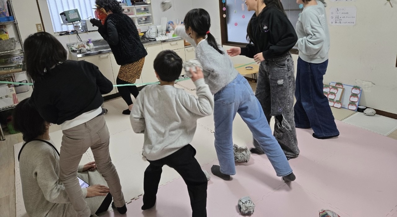 2チームに別れて鬼の顔をした箱に向かって新聞紙で作った豆を投げ入れます。