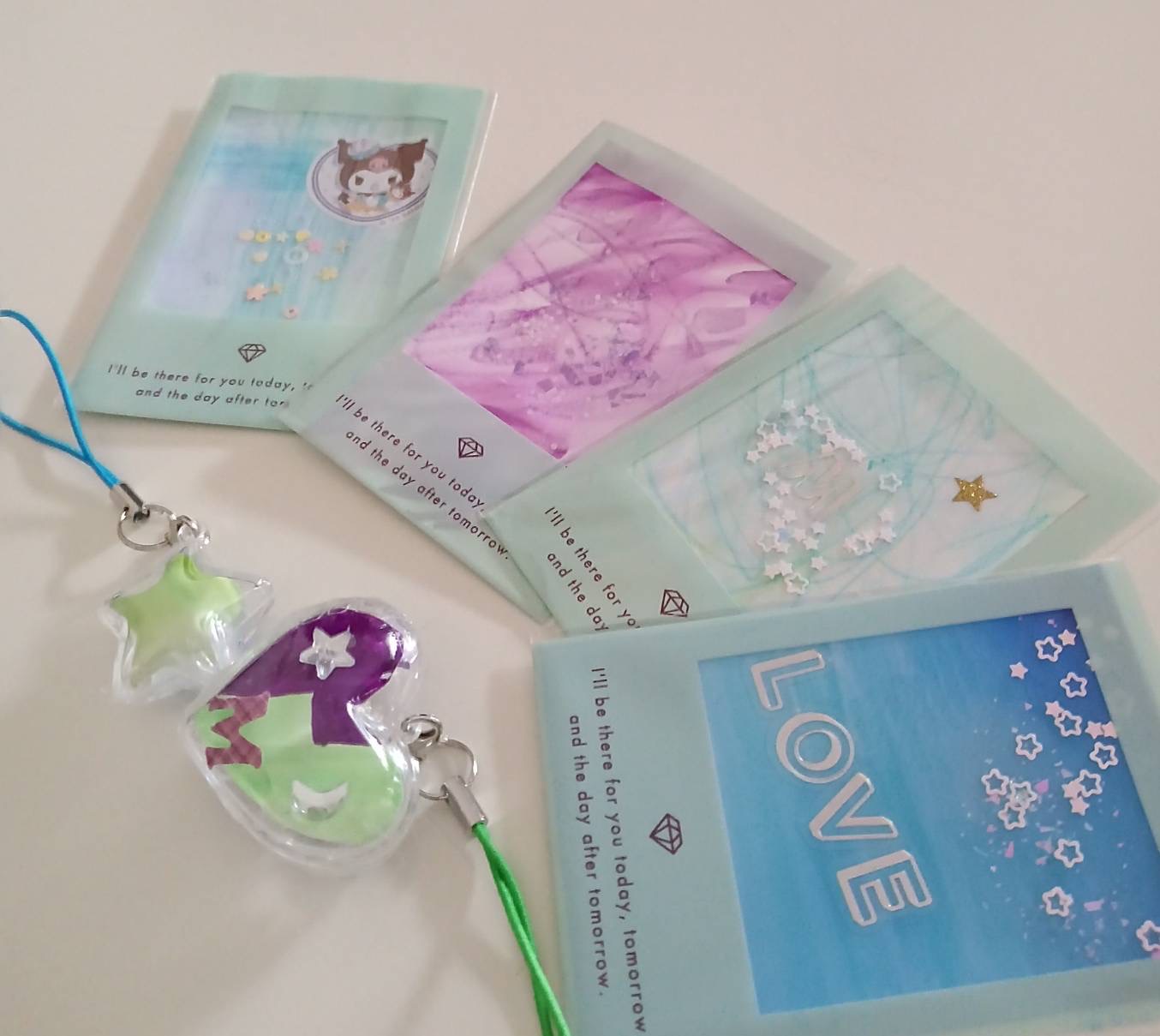 滲ませた後の用紙を切ってデコレーションをしてキーホルダーやオリジナルカードを作りました!