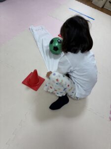 ボールを落とさずにそ〜っと後ろ歩き。